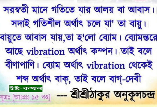 সরস্বতীর আর এক নাম ‘বাগ্-দেবী’। ‘বাক্’ মানে— বাক্য বা শব্দ। তা’ শুনে শ্রীশ্রীঠাকুর বললেন, “তাহ’লে সরস্বতী শব্দেরও দেবতা।”